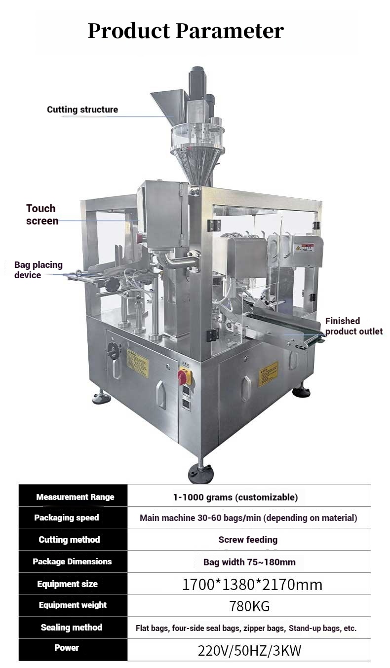 CohoMachine screw powder doypack bag packing machine, which is suitable for quantification, weighing, packaging, filling and sealing of powder products such as coffee powder, seasoning powder, curry powder, pepper powder, chili powder, unrefined, chicken essence, salt, sugar and so on.