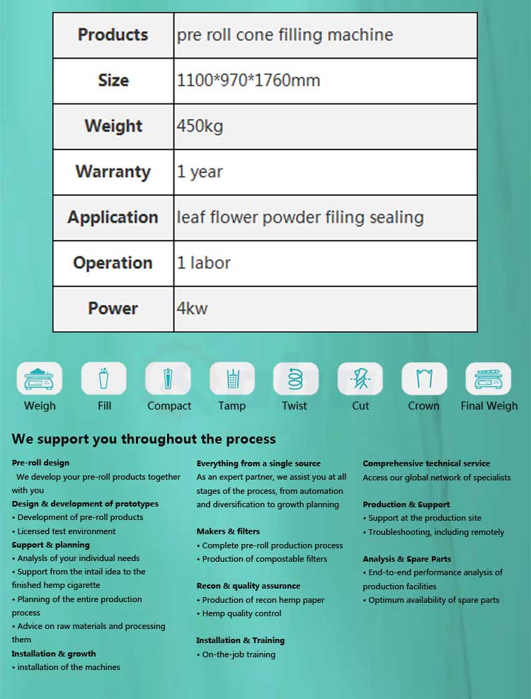 As We know automated pre-roll machines normally fail due to many variables – like the particle size of the flower (coarse), to the moisture content(Very Sticky), to the pre-rolled cones. You can trust us, We have our team to support to help customer to automate their pre-roll filling process.